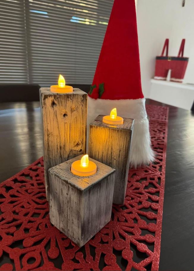 Stix rescued a pile of old fence posts from going on a bonfire and made tea light candle stands. Great for decorating the Christmas dinner table. Or fantastic on the outdoor table for a BBQ, add citronella tea lights to keep the bugs away. Set of three stands and includes three citronella tea lights and three LED faux candles.